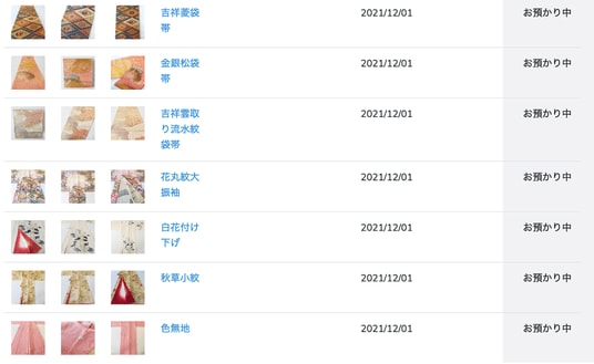 <ご利用の流れはシンプル> ウェブサイトから専用の「着物回収袋」を申し込み、届いた袋に預けたい着物を入れて返送するだけ。 お預かりした着物は、1点ずつ写真撮影を行い、ウェブ上のマイページからいつでも閲覧可能です。(料金:10点 2,200円~)