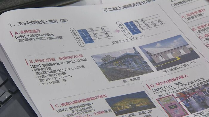 素案では、利用者を増やす施策として、運行本数の増加や車両の更新、新駅の設置に加えて利便性を向上させようと、南富山駅に鉄道と路面電車の乗り換え専用ホームを整備する構想が示されました。