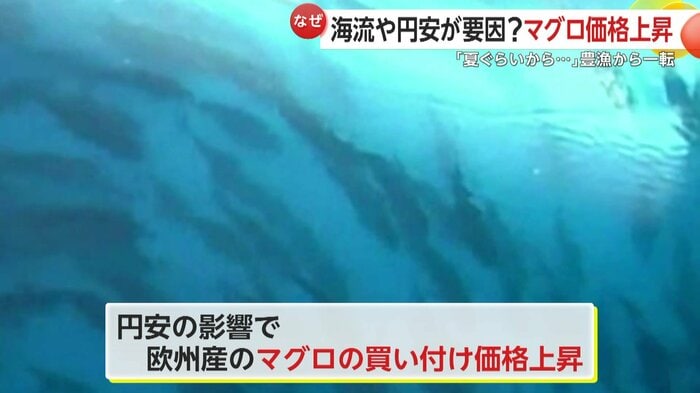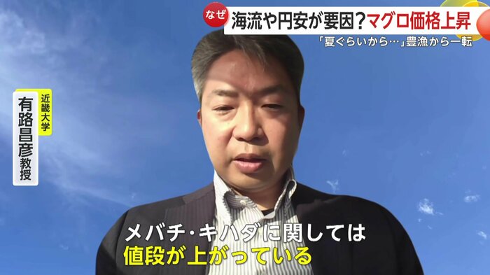 マグロの価格が上昇している背景について、近畿大学の有路昌彦教授は「キハダ・メバチに関しては今年の初めくらいまで近海で取れていたので非常に単価が下がっていたが、年末にかけて形成される漁場が海流の変化というのもあって、供給量がすごく減っている。メバチ・キハダに関しては値段が上がっている」と話す。
