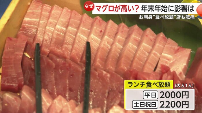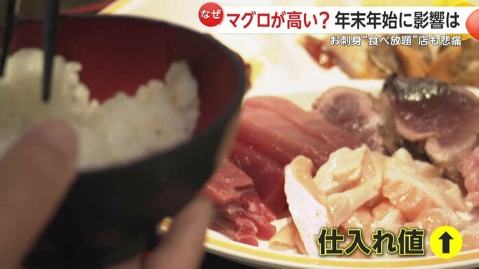 この店では、その日安く仕入れることができるマグロを食べ放題で提供しているが、最近は仕入れ値が上昇し、頭を悩ませているという。