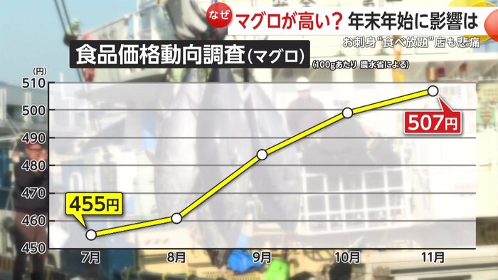農水省が行っている全国470店舗への食品の価格動向調査では、2025年7月のマグロ100グラム当たりの小売価格は455円だったが、そこから右肩上がりに上昇し、11月は507円と、50円以上値上がりしている。