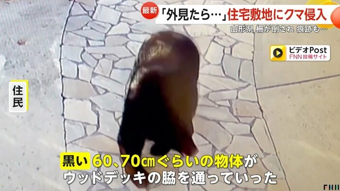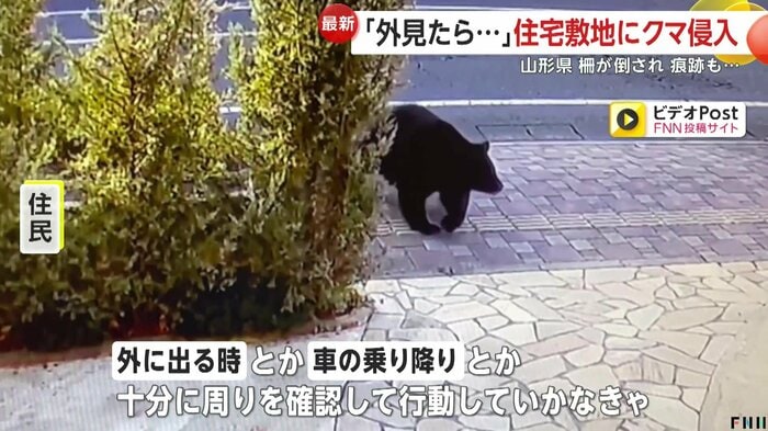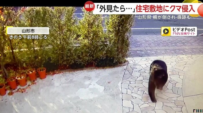 11月30日午前8時頃、山形市の住宅に設置された防犯カメラが捉えた映像には、クマが道路を横切り、住宅の敷地へと侵入する姿が映っていた。