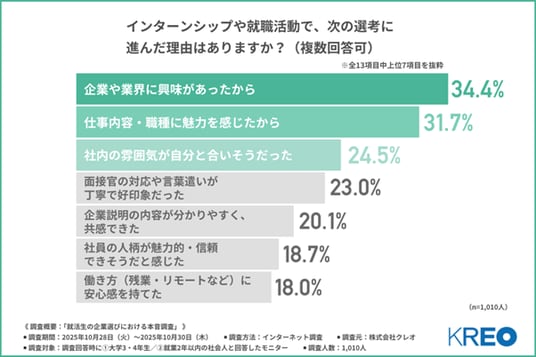 今回の調査で、就活生がどのような基準で企業を判断しているのか、また、どういった情報を求めているかといった、企業選びに対する本音が明らかになりました。次の選考に進む理由としては、「企業や業界への興味」「仕事内容・職種への魅力」といった前向きな関心が挙がりました。一方で、進まなかった理由には「社内の雰囲気が合わない」「働き方への不安」など、実際の働く環境に対する懸念が中心となりました。
