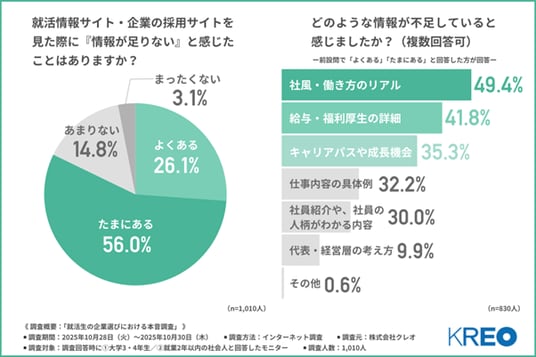 「就活情報サイト・企業の採用サイトを見た際に『情報が足りない』と感じたことはあるか」と尋ねたところ、約8割が『よくある(26.1%)』『たまにある(56.0%)』と回答しました。