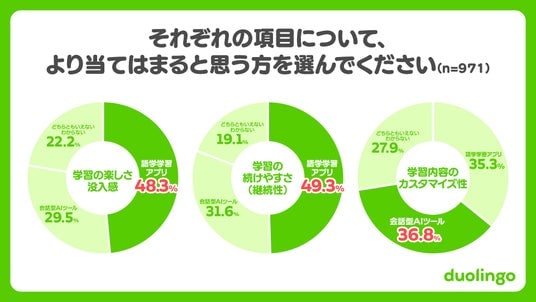 ・会話型AIツールの利用が拡大する一方で、語学学習体験ではアプリに軍配