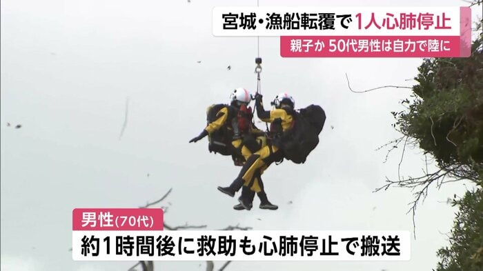 漁船には親子とみられる2人が乗っていて、70代の男性がおよそ1時間後に救助されたが、心肺停止の状態で病院に運ばれた。50代の男性は、自力で陸に上がった。