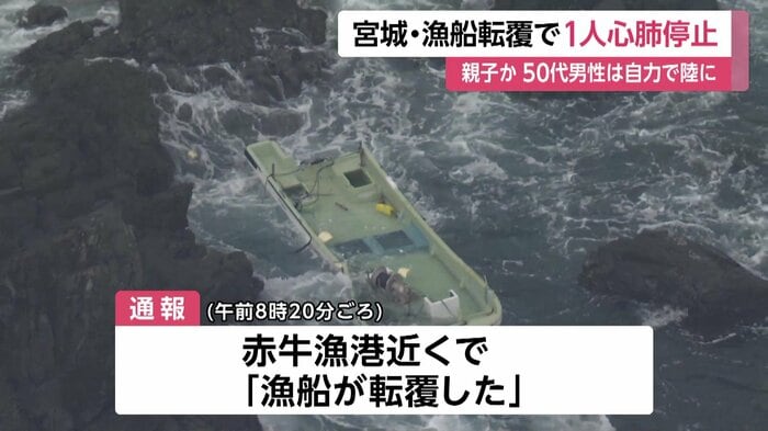 2日午前、宮城県気仙沼市の漁港近くで、漁船が転覆し、乗っていた1人が心肺停止の状態となっている。