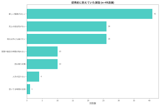 提携ベーカリー(n=49)への調査では、導入前の課題として「新しい販路がほしい(41件)」「売上の安定性がない(26件)」などが挙げられていました。