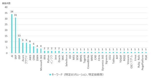 最も多く登場したのは「AI」(34件)および「SAP」(31件)で、次いで「ERP」「Azure」「クラウド」「AWS」など、業務・インフラ双方で主要なプラットフォーム技術が並びました。
