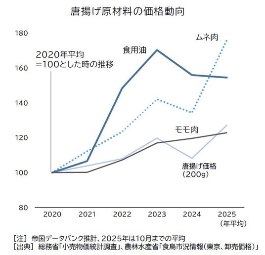 「持ち帰り」を前提とする唐揚げビジネスは、参入コストの低さやオペレーションの簡便さ、根強い人気を背景に、大手飲食チェーンから個人店まで様々な企業が参入してきた。他方、コロナ禍が明けてブームが収束し、成長が見込まれた唐揚げ市場は一転、限られた需要を多数の事業者が奪い合う「レッドオーシャン」となり、短期間で競争が激化。唐揚げの原材料として使用される鶏肉価格も高止まりが続くほか、調理に必要なキャノーラ油、店舗スタッフの人件費、光熱費といった各種コストが急増し、安価な原材料で利益を出す「唐揚げビジネス」の前提も崩れている。