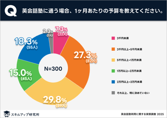英会話塾に通う際の1ヶ月あたりの予算について、300名に調査したところ、「5千円~1万円未満」が最も多く(29.8%)、「月1万円未満」が全体の過半数(57.1%)を占めた。