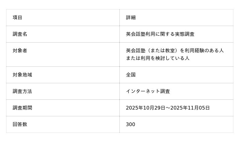 そこで、本調査「英会話塾利用に関する実態調査2025」では、英会話塾の利用経験者および利用検討者300名を対象に調査を行い、英会話塾利用の実態と、受講者が求める英会話塾の姿を探った。