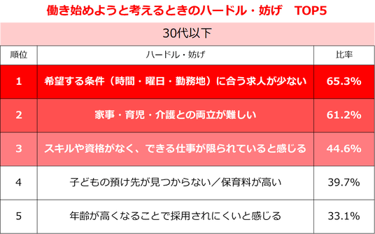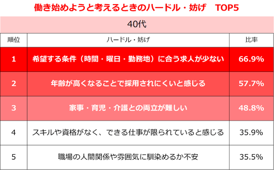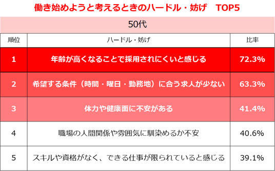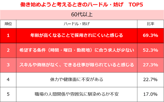 「年齢」60.2%、「家事・育児・介護と両立」37.6%。年代別のハードルTOP5で傾向に違い~しゅふJOB総研調査~