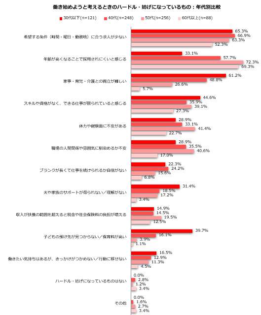 2.働き始めようと考えるときのハードル・妨げになっているもの:年代別比較