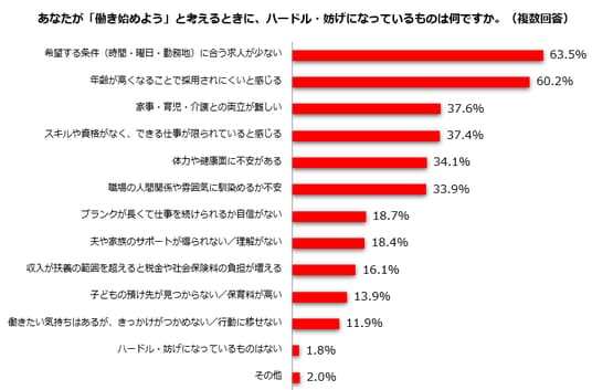 ライフイベントが生じるタイミングは人それぞれ異なり、仕事から離れたり再び始めたりするタイミングも異なります。仕事と家庭の両立を希望する主婦・主夫層に「あなたが「働き始めよう」と考えるときに、ハードル・妨げになっているものは何ですか」と尋ねたところ、「希望する条件(時間・曜日・勤務地)に合う求人が少ない」が最も多く63.5%でした。主婦・主夫層の仕事選びは、条件の制約が多い様子が伺えます。さらに、「年齢が高くなることで採用されにくいと感じる」が60.2%で2位、「家事・育児・介護との両立が難しい」37.6%が3位と続きました。