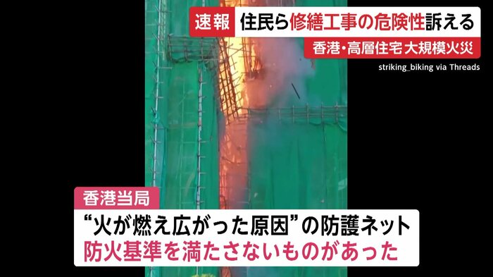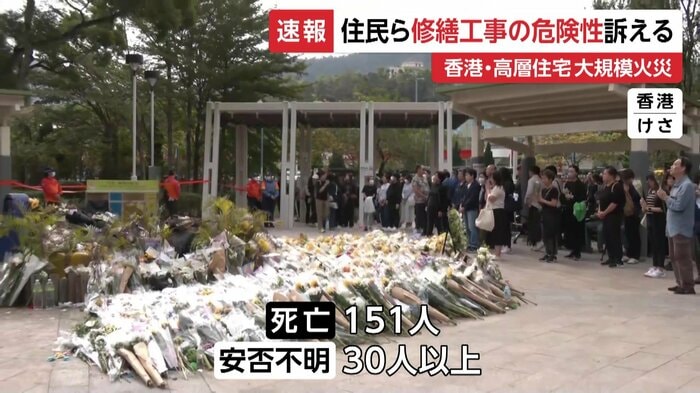 香港の高層住宅の大規模火災をめぐり、住民らが住宅で行われていた修繕工事について、当局に危険性を訴えていたことが分かった。高層住宅の火災では、これまでに151人の死亡が確認され、30人以上の安否が分かっていない。