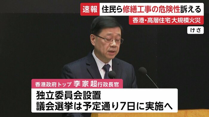 一方、香港政府のトップ李家超・行政長官が会見し、なぜ火が急速に燃え広がったのかなどを調査する「独立委員会」を設置するほか、議会選挙を予定通り7日に実施すると表明した。