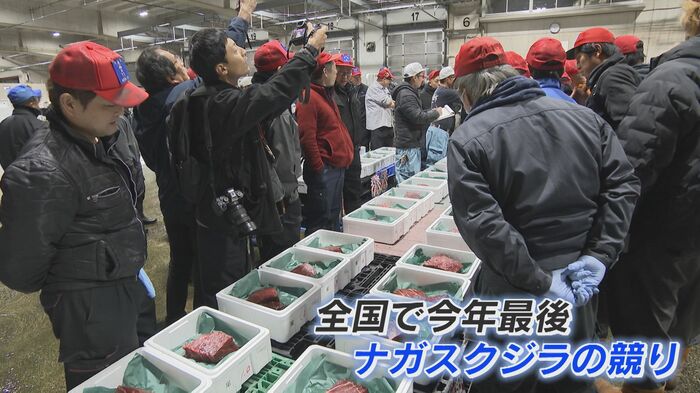 全国的にみても2025年、最後となるナガスクジラの競りとあって、市場内には威勢のいい声が響き渡った。