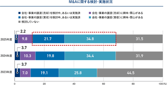M&Aに関する検討・実施状況を年別に見ると、2025年には「譲受(買収)を検討中・実施済み」(21.7%)と「譲受(買収)に興味・関心あり」(34.8%)を足すと過半数に達しており、2023年から一貫して上昇傾向を示しています。一方で、「譲渡(売却)」についての検討・実施や関心が約1割にとどまり、「検討していない」は31.5%と前年とほぼ変わらない結果となりました。自社の成長を目的とした譲受への関心は、年々高まっていることが分かります。
