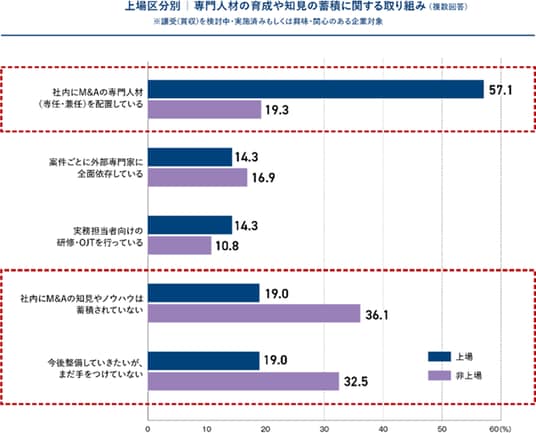 M&A人材の育成や知見の蓄積状況について、上場企業では「専門人材を配置している」(57.1%)が過半数を占めており、一定の体制構築が進んでいることが分かります。一方、非上場企業では「知見・ノウハウが蓄積されていない」(36.1%)や「今後整備したいが未着手」(32.5%)が多く、外部への依存傾向が強い状況が見られました。上場企業と非上場企業の間で、専門人材等の整備の進捗度合いに明確な差が表れていることが確認できます。