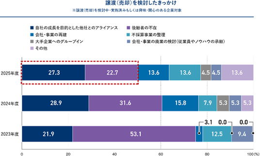 (2) 譲渡(売却)検討理由では、かつて過半数を占めていた「後継者不在」が半減し、「自社の成長を目的とした他社とのアライアンス」「会社・事業の再建」などを目的とした多様な理由が上位に並ぶ構図へと変化していることが分かりました。