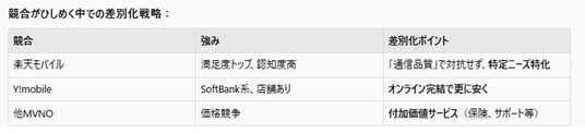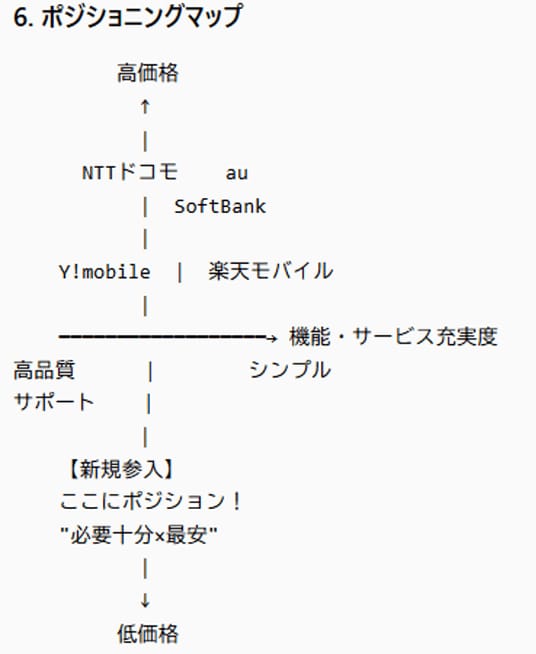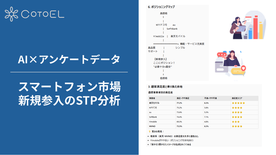 分析結果1.よりスマートフォン市場は成熟期で、格安市場もレッドオーシャン化していることが分かりました。これから新規に市場参入する場合はどの様な戦略が考えられるでしょうか?次に【新規参入企業のSTP分析】を指示し、「顧客満足度と乗り換え余地」「競合との差別化戦略」「ポジショニングマップ」など、全8項目の詳細な分析結果が自動生成されました。