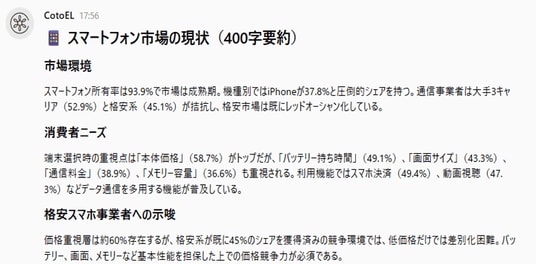 AI分析サービス「CotoEL」が調査データをもとにスマートフォン市場の現状を分析し、その結果を400字程度に要約した本文です。