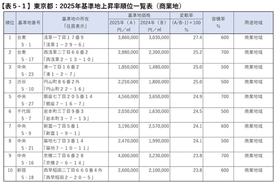 23区内の基準地(商業地)で上昇率がもっとも高かったのは、台東区浅草1丁目(27.4%上昇)で、2位は同区西浅草2丁目(25.2%上昇)です。浅草周辺はインバウンドを含めた観光客の増加により、店舗や飲食店の需要増加に加え、ホテル建設などが進んでいることが高い上昇率の要因と言えるでしょう。また、上位10位内に中央区が5地点ランクインしていますが、銀座や築地、京橋、新富町などの駅周辺でホテルやオフィスの需要が高いことを表しています【表5-1】。
