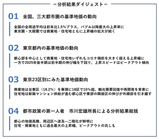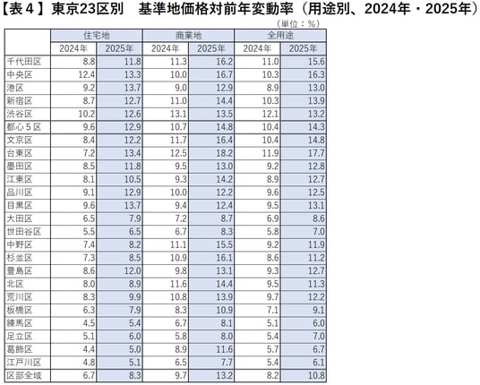 ・商業地は台東区(18.2%)を筆頭に18区で10%超、観光需要回復や再開発を背景に・住宅地は新築マンション供給が進む都心区や東部の隣接区の伸びが外縁部を引き離す