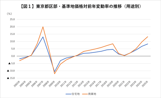 とくに都心5区では、2025年に商業地で14.8%(10.7%)上昇、住宅地で12.9%(9.6%)上昇であり、商業地、住宅地とも都心部の上昇率の高さが目立っています。