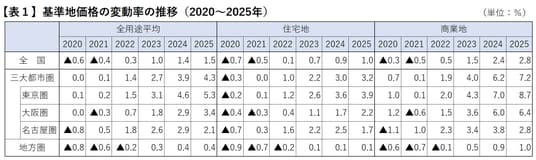2025年の基準地価によると、全国の住宅地・商業地を含む全用途平均で前年比1.5%上昇と4年連続の上昇となり、上昇率は1991年(3.1%)以来の高さとなりました【表1】。