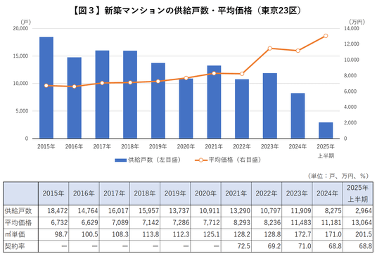 最近の東京23区の新築分譲マンション市況は、2025年上半期に1戸当たり平均価格が1億3,064万円、1平方メートル 当たり単価が201.5万円ですが、供給戸数が2024年以降急激に減少しているために価格高騰に拍車をかけています。その結果、マンション価格の上昇率は過去10年以上にわたって地価の上昇率を上回っています。