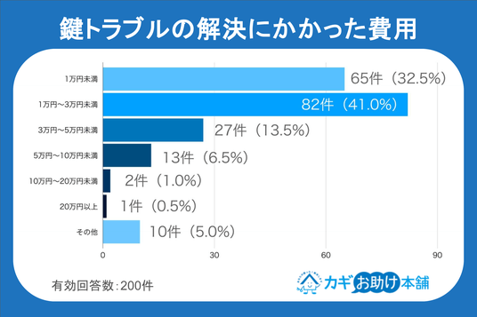 実際に鍵トラブルの解決にかかった費用については、「1万円~3万円未満」(41.0%)が最も多く、次いで「1万円未満」(32.5%)となりました。