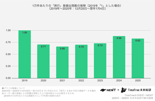 TimeTreeに登録された予定データから、2019年以降7年間における年末年始(12月25日~翌年1月4日)の「旅行」予定の推移を分析した結果、2025年の年末年始の旅行予定登録数は2019年比で83%となりました。一時期はコロナ禍の影響で大きく減少しましたが、2022年以降は回復基調に転じ、2023年73%、2024年88%と上昇を続けてきました。2025年は前年を5ポイント下回ったものの、コロナ前の8割超の水準を維持しており、回復基調は継続しています。一方で、物価高や宿泊費の上昇を背景に、日本人の旅行需要の伸びに一服感が見られる結果となりました。