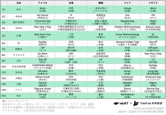一方、アメリカとイギリスでは「Work(仕事)」が1位となり、年末年始も通常営業を継続する社会が反映されています。興味深いことに、イギリスでは「Boxing Day(12月26日の祝日)」、ドイツでは「Zweiter Weihnachtstag(クリスマス翌日)」が上位に入っており、両国ではクリスマスの翌日も祝日として定着している文化の違いも見られます。
