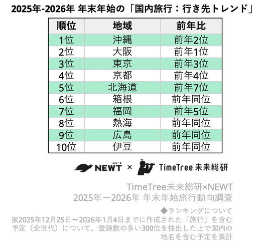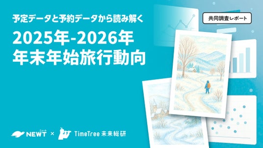 株式会社TimeTree(本社:東京都新宿区、代表取締役社長:深川 泰斗)の社内研究所『TimeTree未来総合研究所』(https://timetreeapp.com/intl/ja/future-research-institute)と株式会社令和トラベル(本社:東京都渋谷区、代表取締役:篠塚 孝哉)が運営する、かしこい、おトク、旅行アプリ『NEWT(ニュート)』は、共同で2025年~2026年・年末年始の旅行動向を分析しました。TimeTree未来総研は、年末年始(2025年12月25日~2026年1月4日)に登録された「旅行」を含む予定データを分析し、旅行アプリ『NEWT』は同アプリにおける予約データを解析しました。