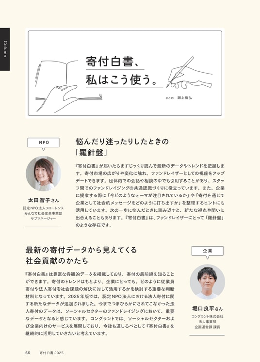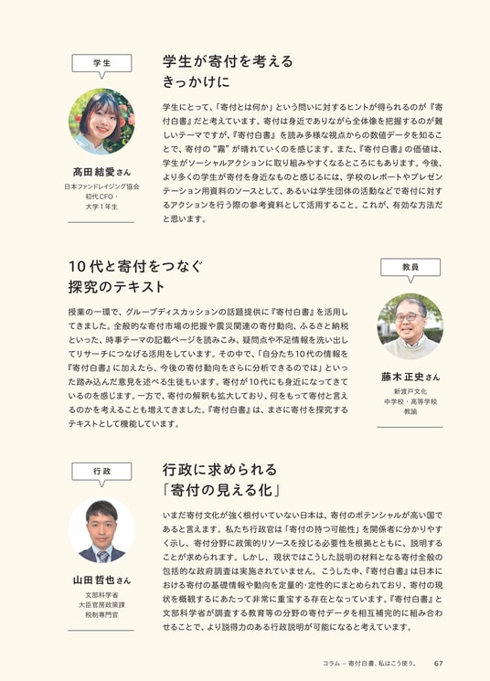 継続的に行われる調査結果を分析した第二部はもちろん、寄付「的」行為の広がり、従来の寄付が果たしてきた役割、そして近年の変化を「読み物」として紹介している第一部は、寄付市場の現在地をアップデートしたいファンドレイザー・NPO関係者だけでなく、「寄付文化がない」と言われることの多い日本社会の在り方へご関心のある全ての方に、重要な示唆のある内容です。本白書P.66-67には、様々な立場の方から、この寄付白書をどう活用するかについての意見を寄せていただきました。
