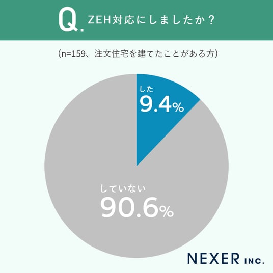 90.6%がZEH対応にしていないと回答し、一般的に認知や関心は高まりつつあるものの、実際の導入にはまだ距離があることがうかがえます。