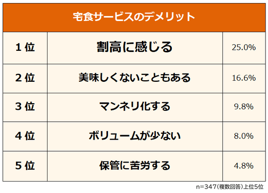 手軽なだけではなく、栄養バランスに配慮されていたり、自宅では作れないようなメニューが食べられたりするのもメリット。一方で「割高」「味が好みではない」「マンネリになりがち」といったデメリットも明らかになりました。