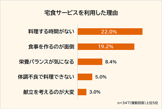 宅食サービスを利用した経験がある347人に「利用した理由」を聞いたところ、1位は「料理する時間がない(22.0%)」でした。2位「食事を作るのが面倒(19.2%)」、3位「栄養バランスが気になる(8.4%)」が続きます。