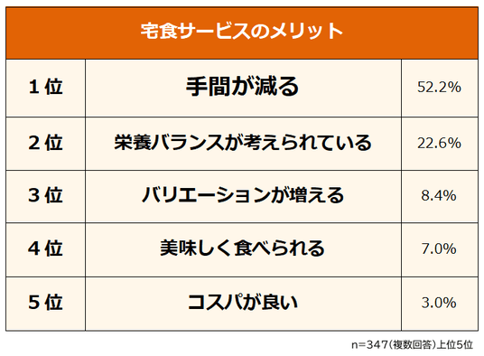 そこで今回、株式会社ビズヒッツ( https://bizhits.co.jp/ )が運営するBiz Hits医療ライティング代行サービス( https://bizhits-medicalwriting.websozai.jp/ )は、宅食サービスを利用したことがある347人に「宅食サービスのメリット・デメリット」についてアンケート調査を実施。その結果をランキング形式でまとめました。