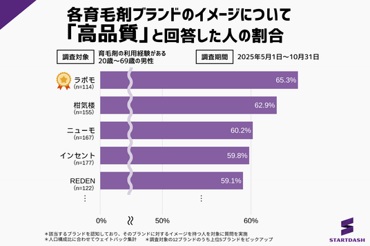 恋愛相談SNSアプリ「kyuun(キューン)」を開発・運営するSTARTDASH株式会社( https://startdash.co.jp/ )(本社:大阪府大阪市、代表:田中将)は、男性の育毛剤選びのヒントを探るため、育毛剤の利用経験がある20代~60代男性を対象に、主要な育毛剤に関するイメージ調査を行いました。