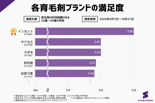 ※本調査は、各回答者にランダムに1つのブランドを提示し、そのブランドについて質問を行っています。各ブランドの有効回答数は、サクセス:340名、柑気楼:331名、不老林:326名、インセント:323名、REDEN:300名、ニューモ:299名、髪殿:296名、ラボモ:292名、ポリピュアEX:287名、加美乃素:285名、ロクシタン:280名、コラージュフルフル:238名です。本リリースでは、人口構成比に合わせてウェイトバック集計した値を、有効数字3桁で表示しています。