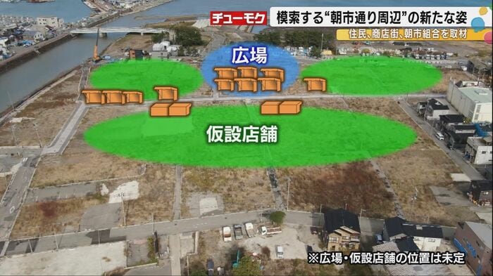 まだ具体的なスケジュールは出ていないが、将来的には朝市通り周辺に屋根付きの広場と本町商店街の仮設店舗が整備され、通りと広場の両方にオレンジ色のテントが並ぶことになるかもしれない。
