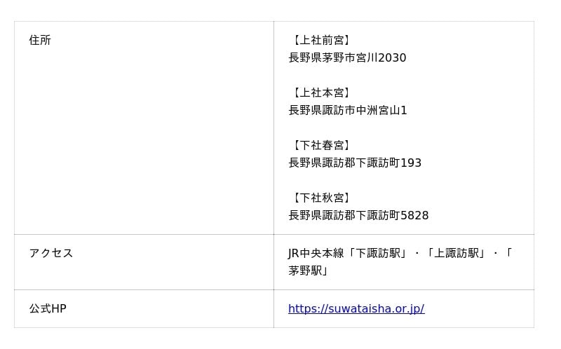 上社前宮と本宮、下社春宮と秋宮の4社から成り立っており、本殿を持たずに山や木など自然物を御神体としています。