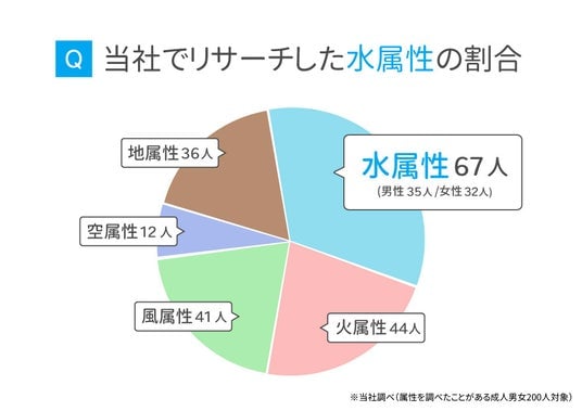 「あなたの属性はなんですか?」と成人男女200人にアンケートをとったところ水属性が67人と最多で、その割合は約34%でした。