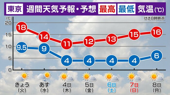 東京は4日(木)の最高気温が11℃と年末ぐらいの気温。これが5日(金)まで続きます。