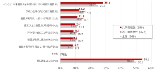 スポーツの活動場所(学校や試合会場)に更衣室が「ない(「時々ないことがある」を含む)」と回答した女子高校生は47.5%に上りました。更衣室がないことで困ったこととして、「トイレなど、本来着替えをする目的ではない場所で着替えることになった」(28.1%)、「着替え場所が人目に付く場所になってしまった」(11.2%)などが挙げられています。