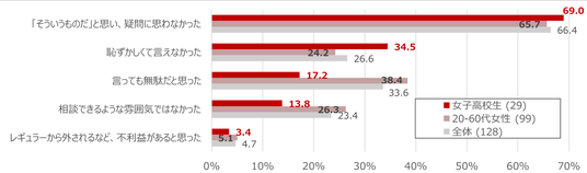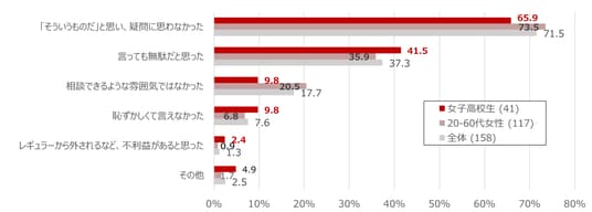 「困ったことがある」と回答した女子高校生のうち、白ユニフォームが原因でスポーツ継続に「不安を感じたことがある」と回答した割合も28.5%に上り、ユニフォームの色や素材が精神的負担となり、競技活動の妨げとなりうることが示唆されました。白ユニフォームについて不満があっても相談しなかった理由として、「『そういうものだ』と思い、疑問に思わなかった」が、女子高校生、高校時代にスポーツをしていた女性ともに最も高く、次に高かった回答として、女子高校生は「恥ずかしくて言えなかった」、高校時代にスポーツをしていた女性は「言っても無駄だと思った」と世代間で違いが見られました。
