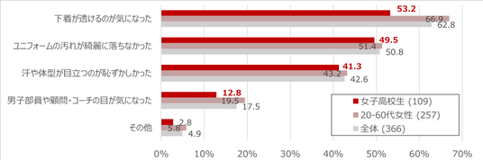 白ユニフォームを着用して「困ったことがある」と回答した女子高校生は48.7%でした。具体的には、「下着が透けるのが気になった」(53.2%)、「汗や体型が目立つのが恥ずかしかった」(41.3%)などが上位に挙げられています。